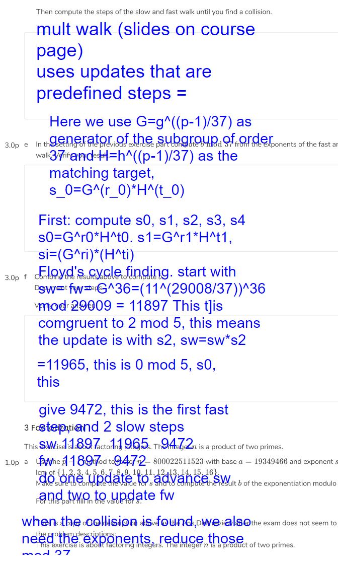 The online exam will take place 13:30 - 16:;30 using Ans Delft. Log in with your TU/e student credentials to find the exam for 2MMC10 called "2MMC10_Cryptology_Q1_20/21_Final Exam". You can also find a practice exam there to see how Ans Delft works. This practice exam is available now till 27 Oct 12:00. You can use the arrows in the bottom row to jump between exercises or click on the boxes in the middle to naviagate between exercise parts. Note that each exercse stars with some defintions that you need to read before you can do the exercise parts.